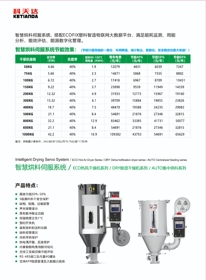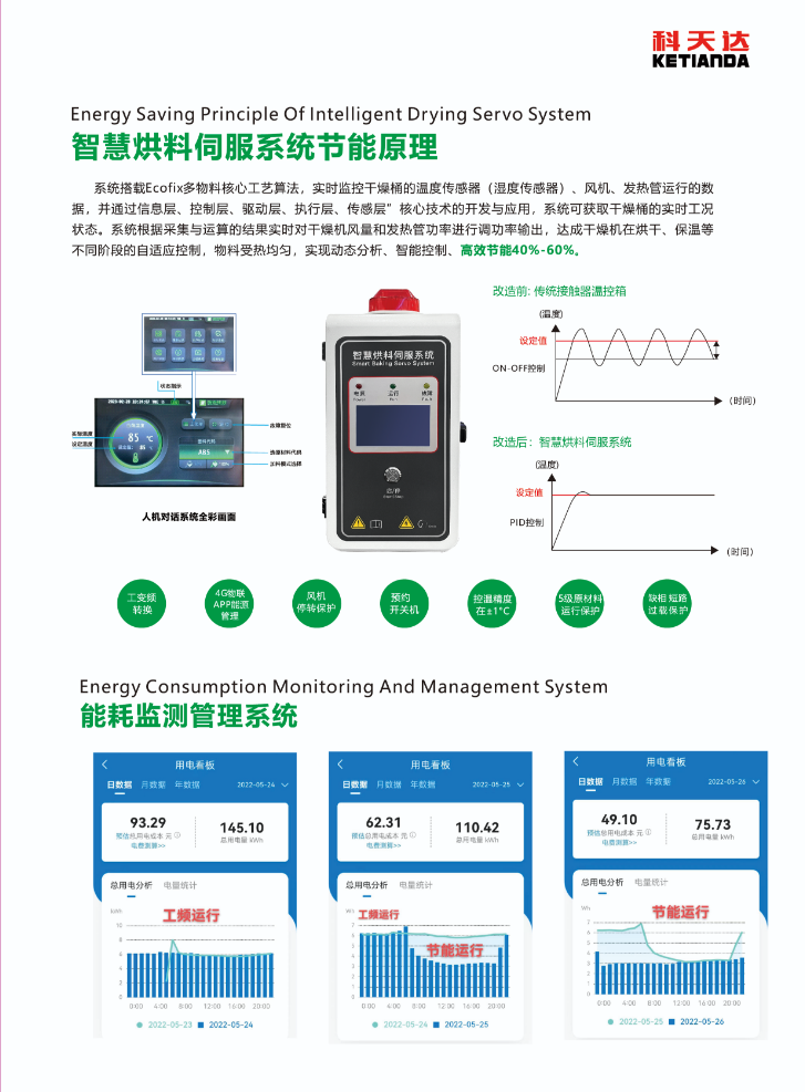 伺服系統(tǒng)干燥機節(jié)能電箱是針對干燥設(shè)備(如塑料干燥機、工業(yè)物料干燥機等)開發(fā)的智能化電能控制單元,其核心是通過 “伺服系統(tǒng)精準(zhǔn)調(diào)控” 與 “節(jié)能算法優(yōu)化”,解決傳統(tǒng)干燥機電能浪費、溫控精度低、運行效率差等問題,廣泛應(yīng)用于塑料加工、化工、食品加工等對干燥工藝要求高且能耗敏感的行業(yè)。
