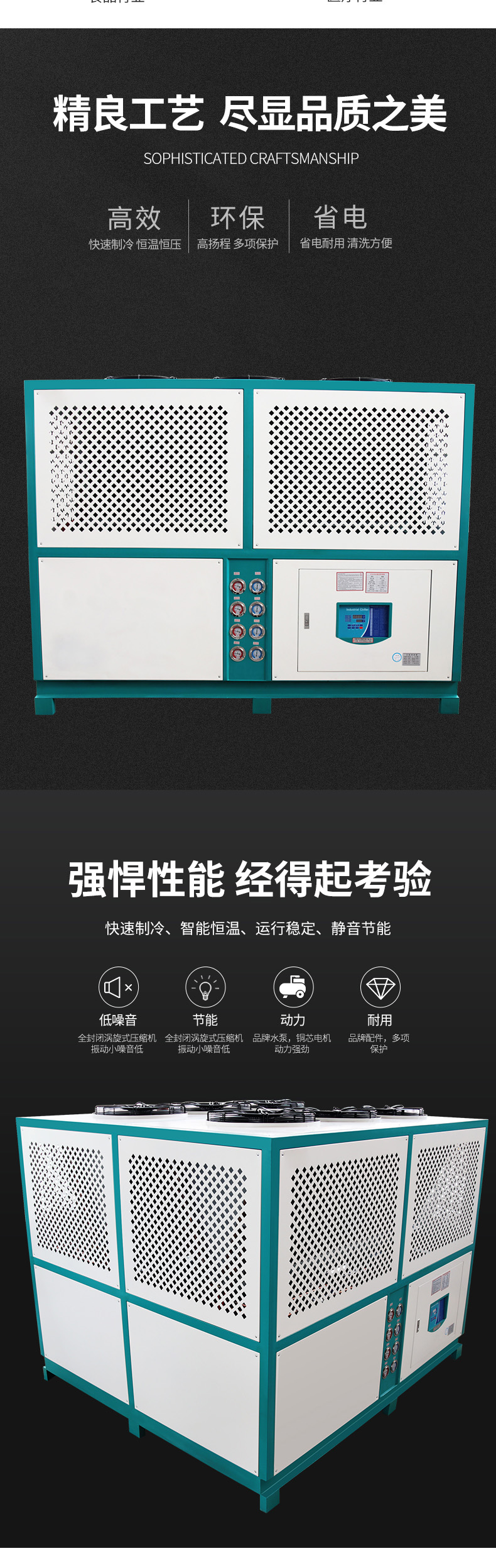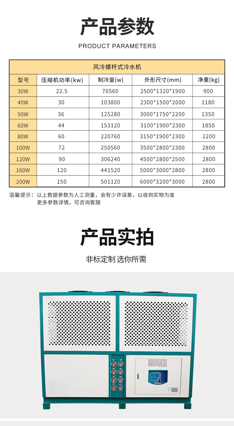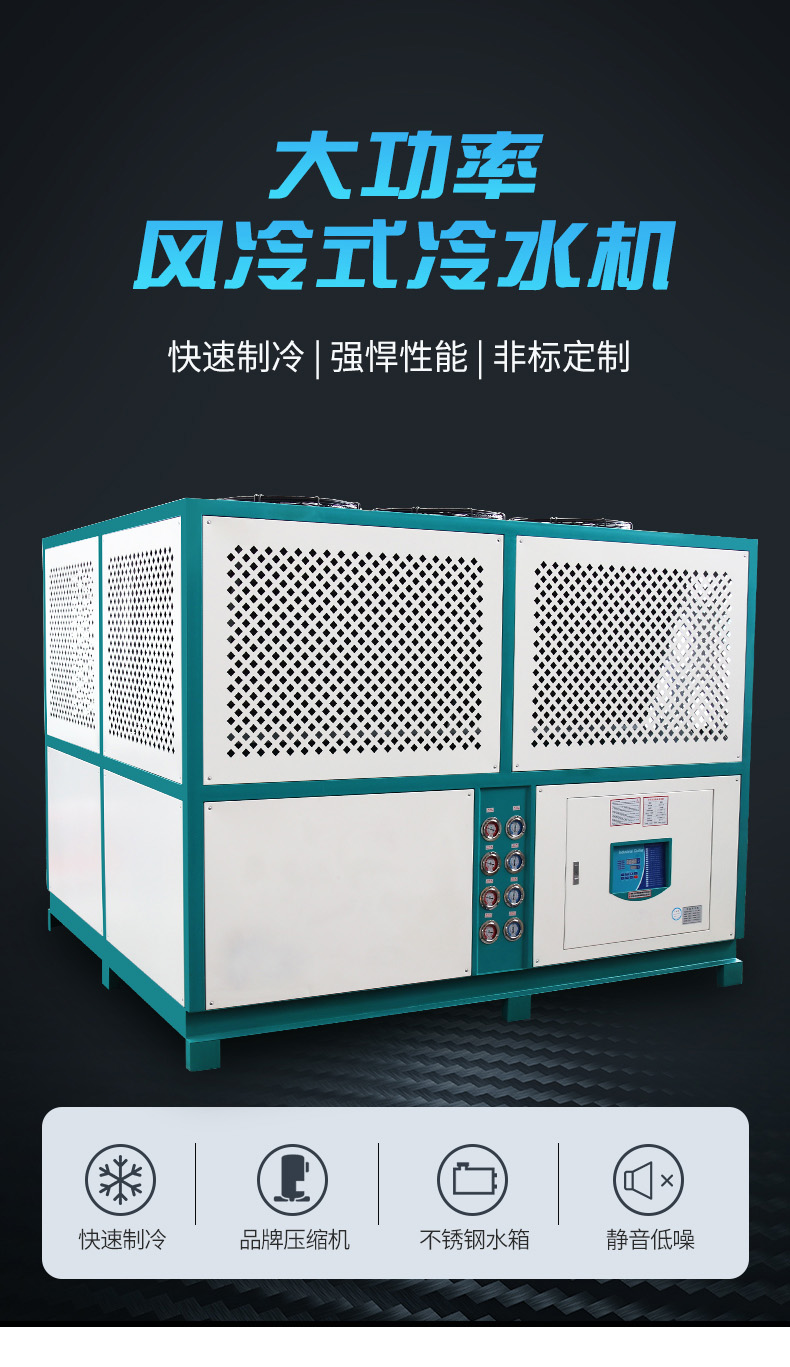2、免裝冷卻水塔,安裝容易,可移動非常方便,適合于水資源缺乏免裝水塔場合。低噪音風機電機馬達,的冷卻冷凝效果,穩定節流機構,優異的防銹處理。采用歐美進口高性能壓縮機,高EER值,噪音低,運行穩。人體工學面板,全自動化控制,配備精密電溫控制器。