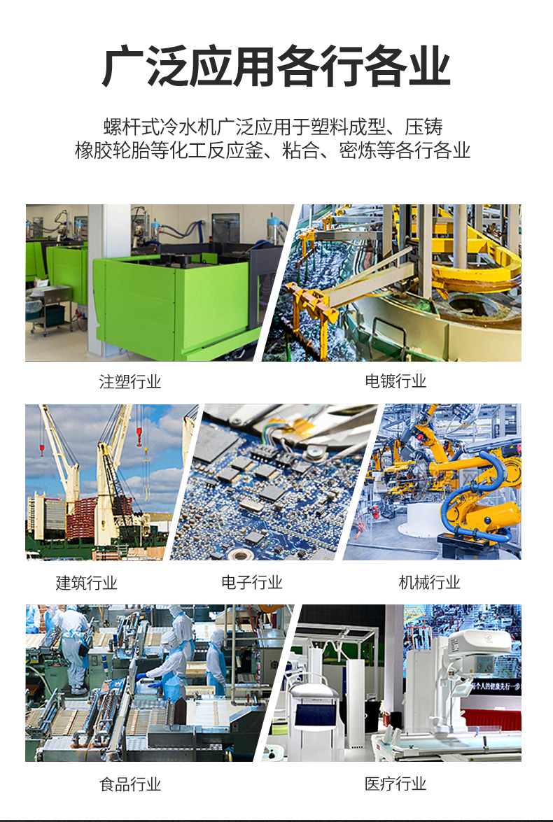 3、低溫螺桿式冷水機是為特殊的低溫環境而設計的螺桿式冷水機,其冷卻能力為賓館,酒樓,超市等商業場所的食品保鮮,大型冷庫肉類,海鮮急凍,冷藏,制冰領域,食品加工冷凍,制藥,化工等各種低溫環境提供了可靠的保障。
